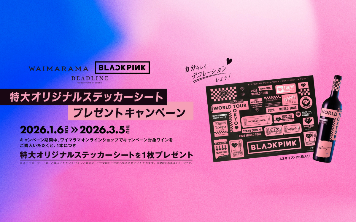 ニュージーランドのプレステージ・ワイン「シャトー・ワイマラマ」の輸入販売を手掛けるワイマラマジャパン株式会社(以下、ワイマラマジャパン)は、世界的アーティスト「BLACKPINK」のワールドツアー「BLACKPINK WORLD TOUR <DEADLINE> IN TOKYO」 に合わせて展開する、「BLACKPINK WORLD TOUR <DEADLINE> IN TOKYO」特大オリジナルステッカーシート付き限定ボトルワインの販売を、2026年1月6日(火)より開始しますので、お知らせします。